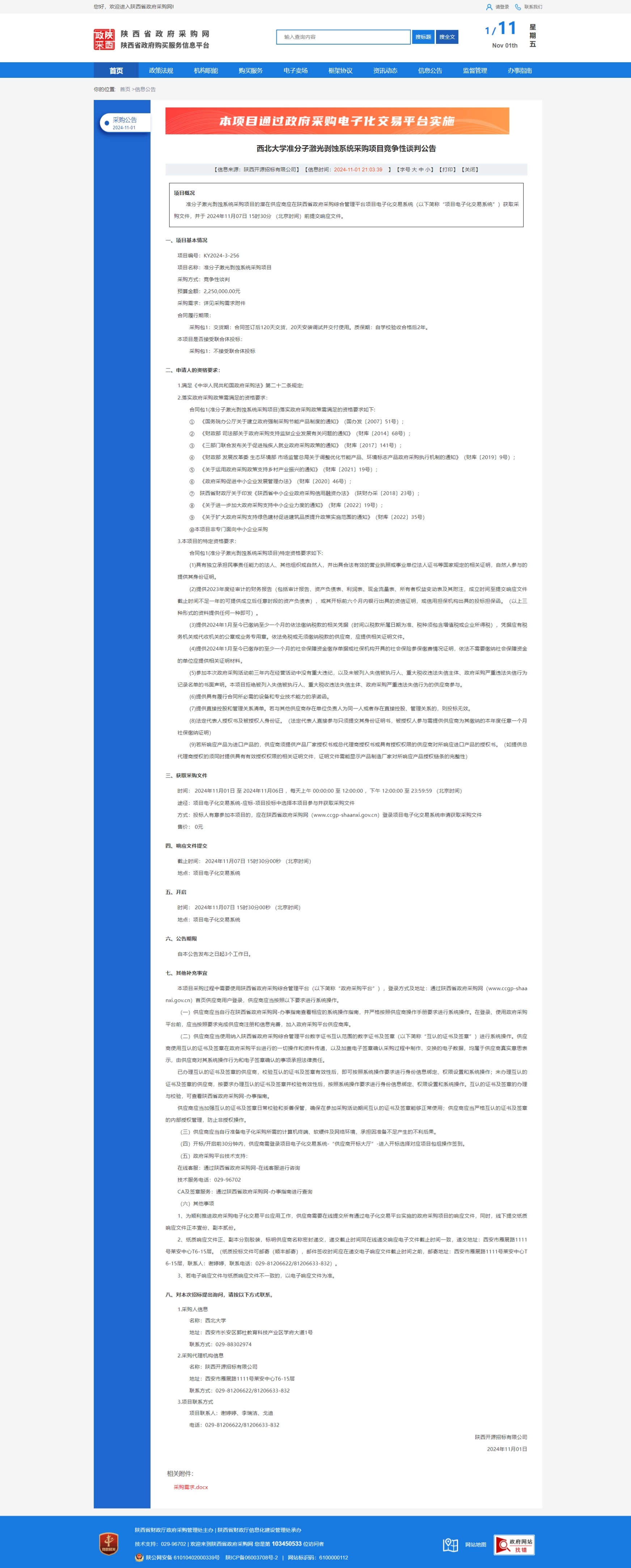 MILAN.COM准分子激光剥蚀系统采购项目竞争性谈判公告 作者: 编辑: 时间:2024-11-01 原公告链接:https://www.ccgp-shaanxi.gov.cn/freecms/site/shaanxi/ggxx/info/2024/8a69c251921857370192e7cd1e6468e7.html?noticeType=001013¬iceId=41ff9c47-9853-11ef-8063-08c0eb20c666