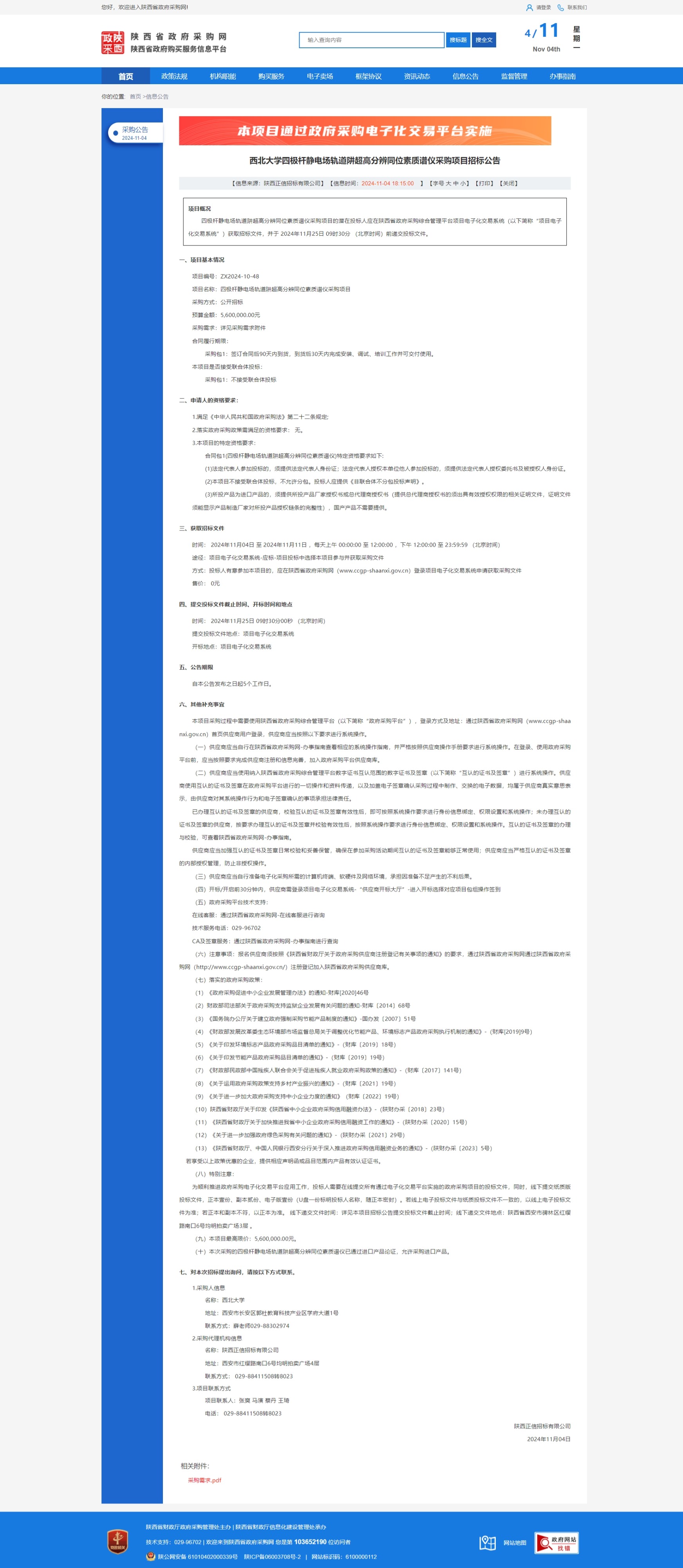 MILAN.COM四极杆静电场轨道阱超高分辨同位素质谱仪采购项目招标公告 作者: 编辑:采购与招标办公室 时间:2024-11-04 原公告链接:https://www.ccgp-shaanxi.gov.cn/freecms/site/shaanxi/ggxx/info/2024/8a69c251921857370192f6a2caf239ff.html?noticeType=001011¬iceId=331afdde-9a97-11ef-8063-08c0eb20c666