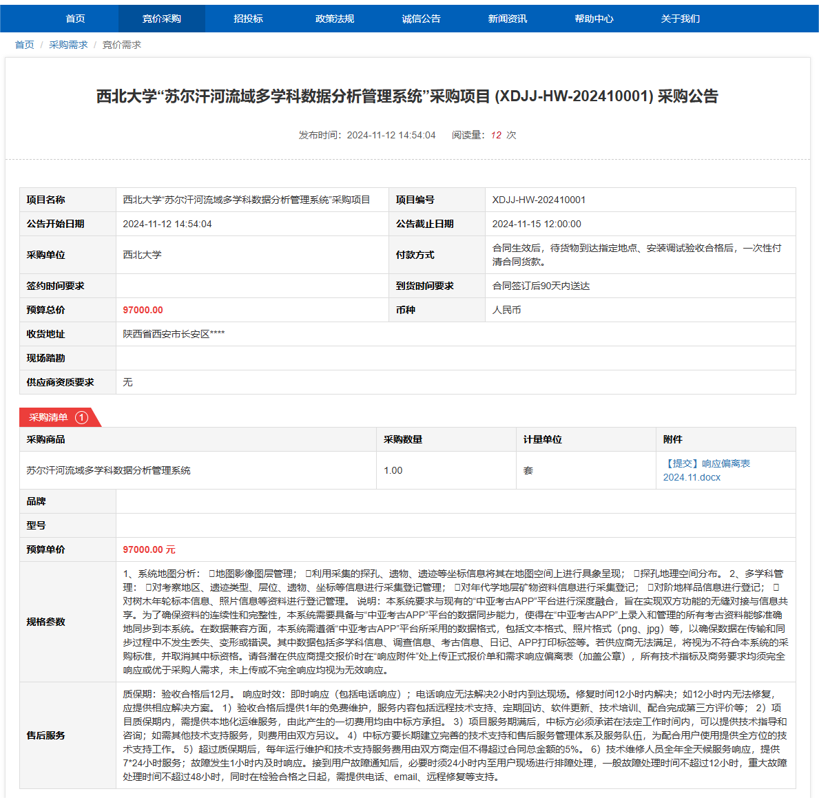 MILAN.COM“苏尔汗河流域多学科数据分析管理系统”采购项目(XDJJ-HW-202410001)竞价采购公告 作者:采购与招标办公室 编辑: 时间:2024-11-12 原公告链接:https://www.ejingcai.com.cn/site/bidding/detail/14753