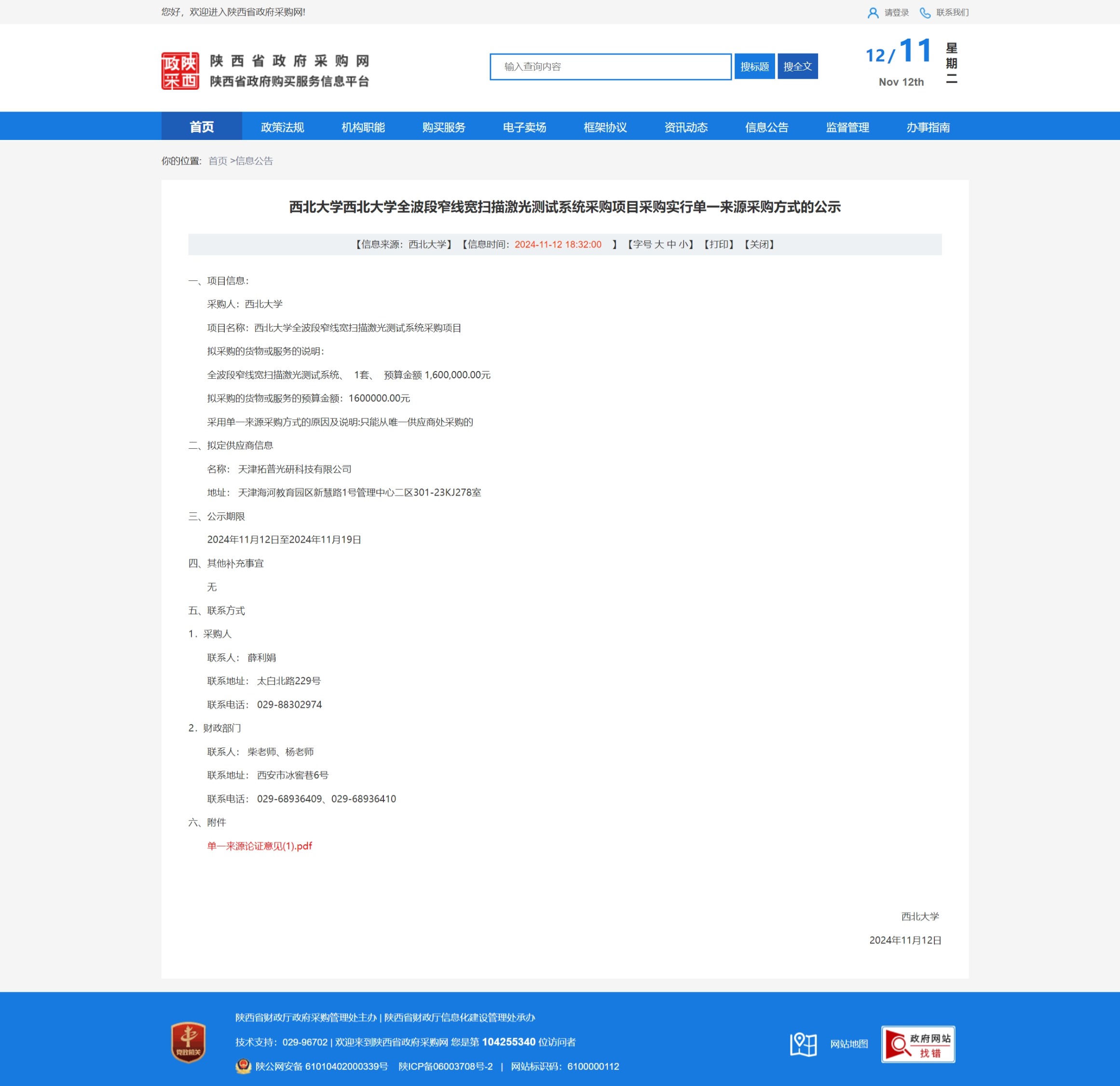 MILAN.COM全波段窄线宽扫描激光测试系统采购项目采购实行单一来源采购方式的公示 作者: 编辑:薛利娟 时间:2024-11-12 原公告链接:https://www.ccgp-shaanxi.gov.cn/freecms/site/shaanxi/ggxx/info/2024/8a69c24d91d6105a01931fd0fd6f6828.html?noticeType=001051¬iceId=e9c41b14-a0e2-11ef-8063-08c0eb20c666
