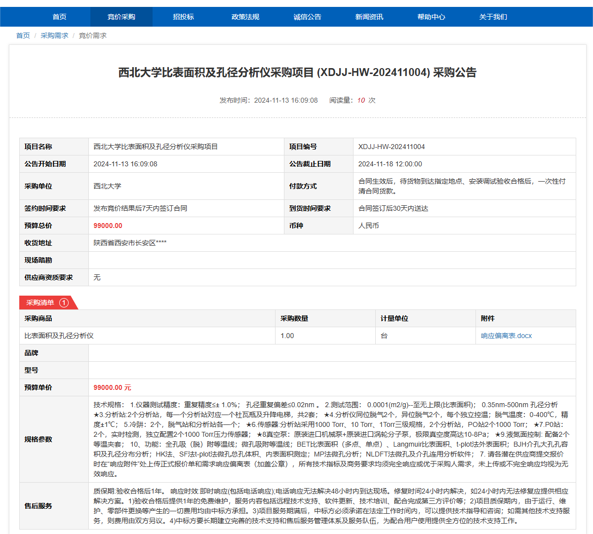 MILAN.COM比表面积及孔径分析仪采购项目(XDJJ-HW-202411004)竞价采购公告 作者:采购与招标办公室 编辑: 时间:2024-11-13 原公告链接:https://www.ejingcai.com.cn/site/bidding/detail/14819