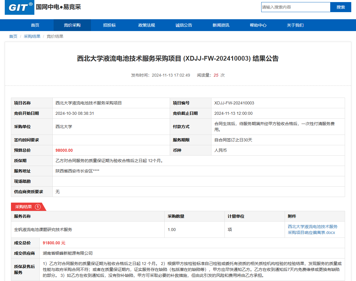 MILAN.COM液流电池技术服务采购项目(XDJJ-FW-202410003)竞价结果公告 作者:采购与招标办公室 编辑: 时间:2024-11-14 原公告链接:https://www.ejingcai.com.cn/site/bidding/detail/14829