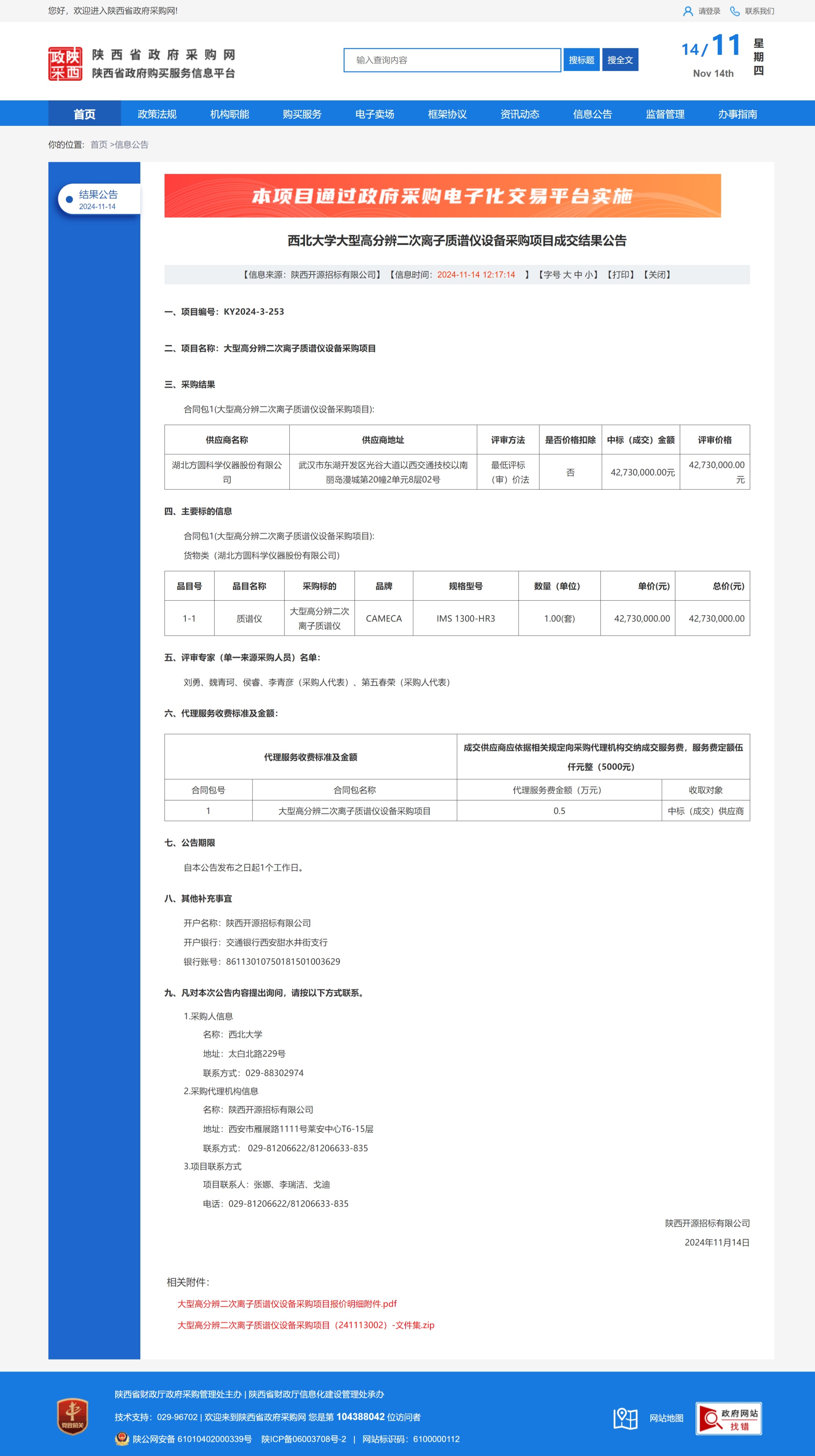 MILAN.COM大型高分辨二次离子质谱仪设备采购项目成交结果公告 作者: 编辑:薛利娟 时间:2024-11-14 原公告链接:https://www.ccgp-shaanxi.gov.cn/freecms/site/shaanxi/ggxx/info/2024/8a69c5a59218576d019328dcd1526537.html?noticeType=001025¬iceId=e4e285ed-a240-11ef-8063-08c0eb20c666