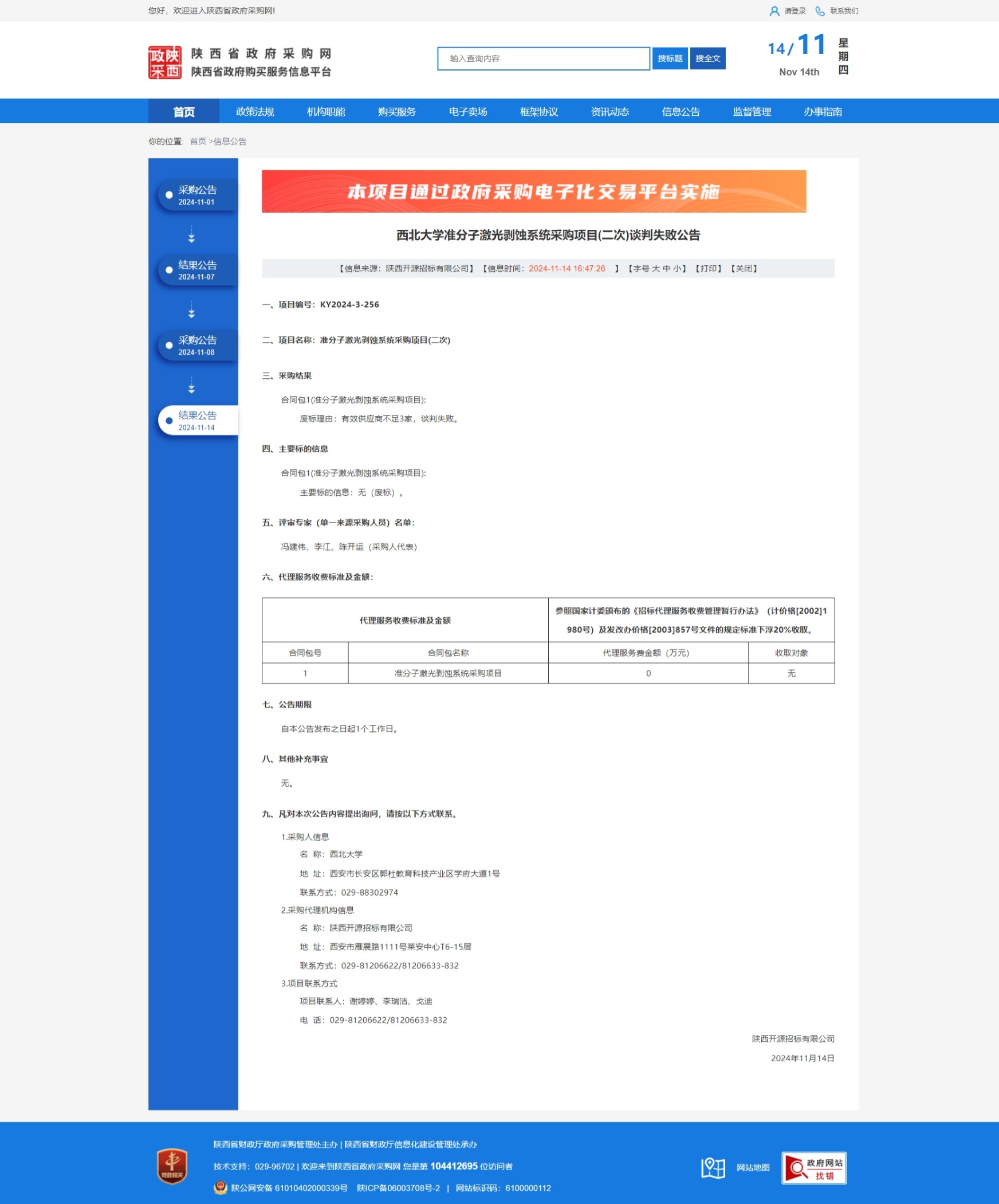 MILAN.COM准分子激光剥蚀系统采购项目(二次)谈判失败公告 作者: 编辑:薛利娟 时间:2024-11-14 原公告链接:https://www.ccgp-shaanxi.gov.cn/freecms/site/shaanxi/ggxx/info/2024/8a69c44e9218572b019329d196666b38.html?noticeType=001006¬iceId=a4a84f2c-a266-11ef-8063-08c0eb20c666