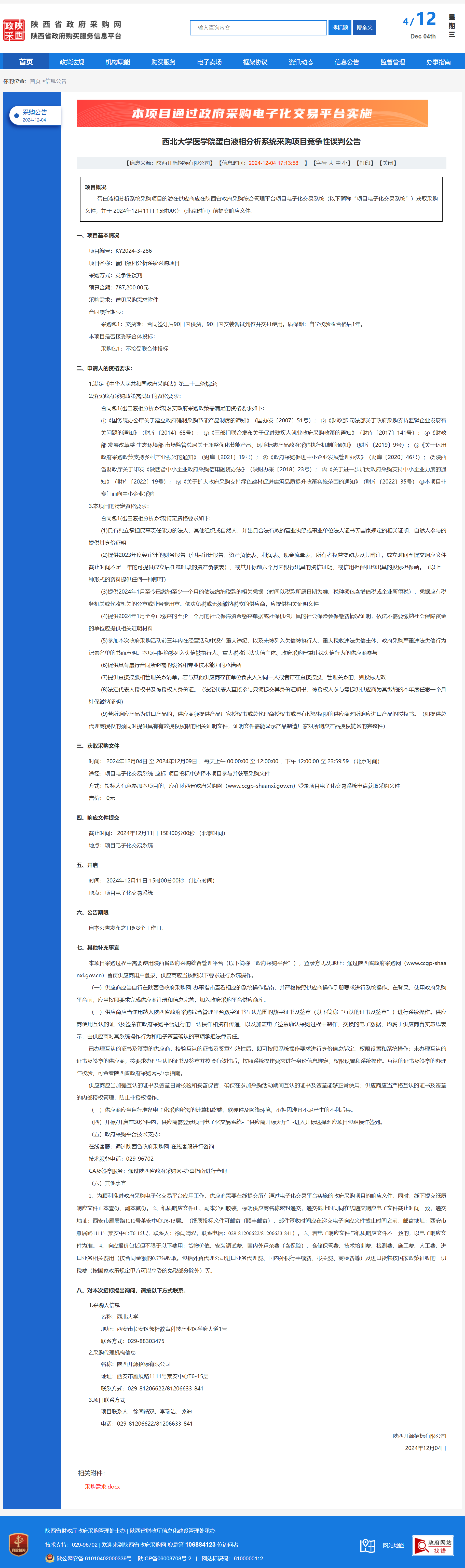 MILAN.COM医学院蛋白液相分析系统采购项目竞争性谈判公告 作者:采购与招标办公室 编辑: 时间:2024-12-04 原公告链接:https://www.ccgp-shaanxi.gov.cn/freecms/site/shaanxi/ggxx/info/2024/8a69c25192185737019390c312de08f0.html?noticeType=001013¬iceId=b3194844-b221-11ef-8063-08c0eb20c666