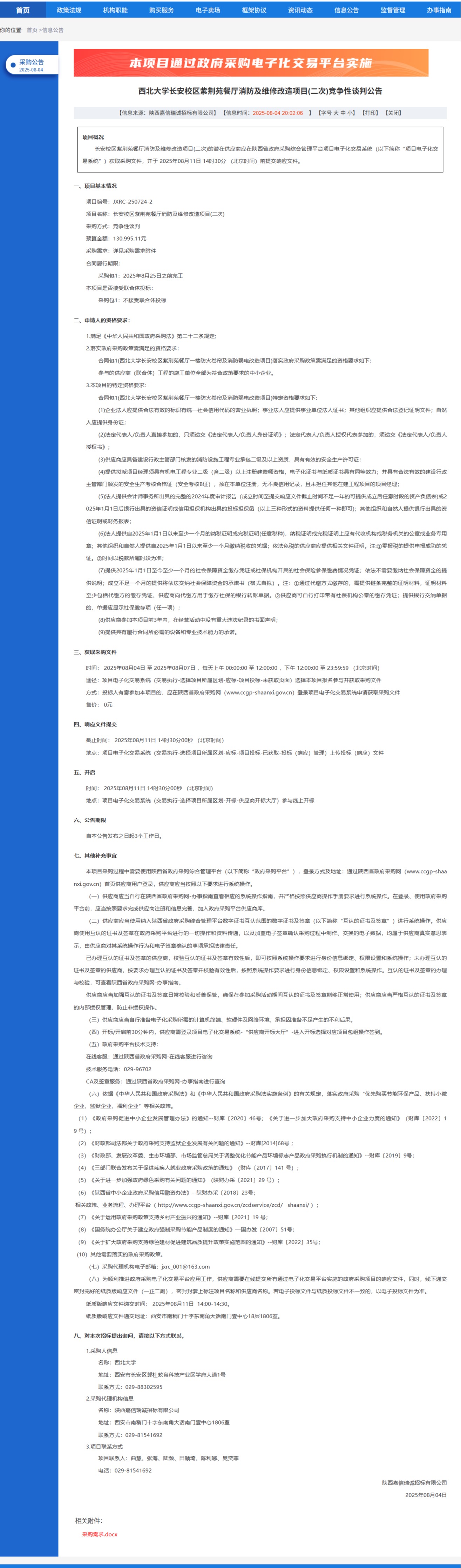 MILAN.COM长安校区紫荆苑餐厅消防及维修改造项目(二次)竞争性谈判公告 作者: 编辑:党丹珩 时间:2025-08-04 公告地址:https://www.ccgp-shaanxi.gov.cn/freecms/site/shaanxi/ggxx/info/2025/8a69c1e29860ef6f019874c6b4a22713.html?noticeType=001013¬iceId=e37c65dc-712c-11f0-8063-08c0eb20c666