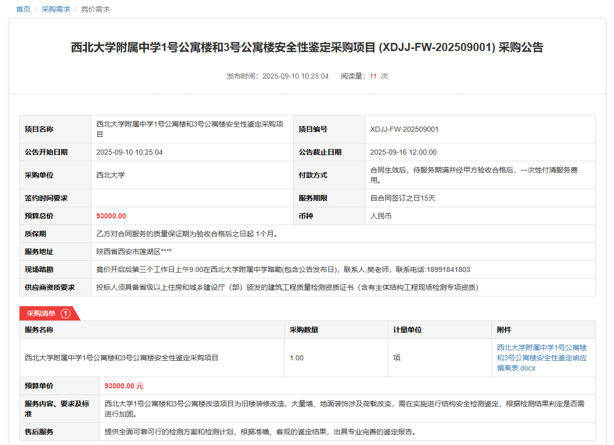 MILAN.COM附属中学1号公寓楼和3号公寓楼安全性鉴定采购项目(XDJJ-FW-202509001)竞价采购公告