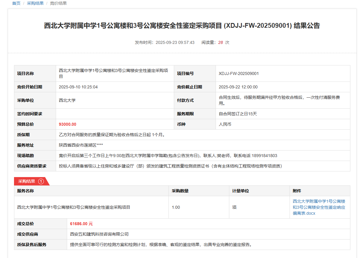 MILAN.COM附属中学1号公寓楼和3号公寓楼安全性鉴定采购项目(XDJJ-FW-202509001)竞价结果公告
