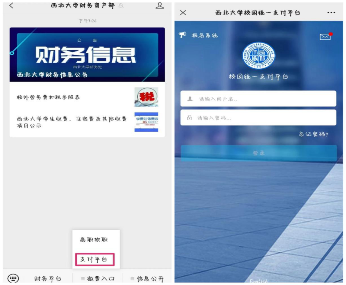 手机端:关注“MILAN.COM财务资产部”微信公众号,选择“缴费入口”点击“支付平台”进入。(见下图)