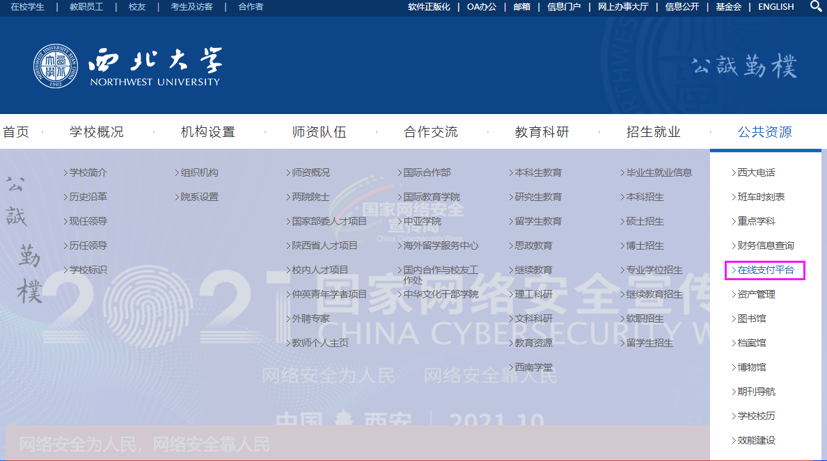 电脑端:登录学校官网米兰(中国),右上角选择“公共资源”频道,点击“在线支付平台”进入。(见下图)