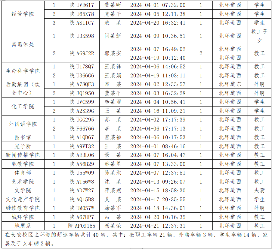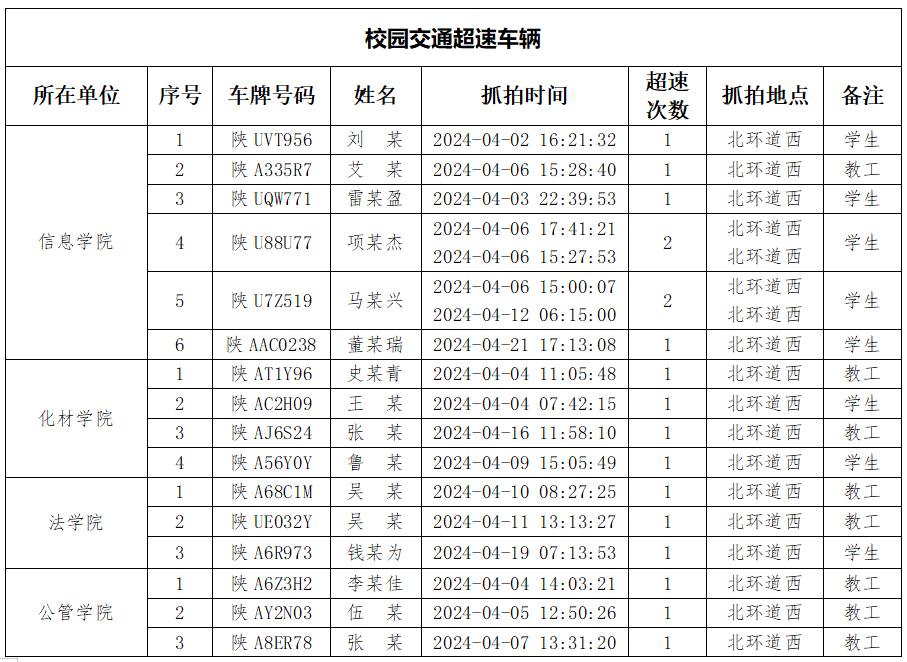 为加强校内道路交通安全管理,规范校内交通秩序,根据《MILAN.COM校园道路交通管理办法》有关要求,现将2024年4月校园交通违章车辆予以曝光,4月份教工超速车辆占52%、学生超速车辆占35%、外聘职工及教工家属车辆占12%,请所在单位加强对本单位违章师生员工的教育和管理,对于校内曝光超速的学生车辆将取消下一年度的通行证办理资格。