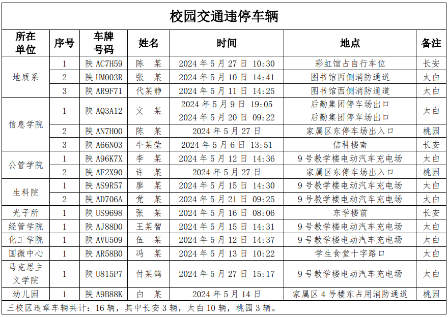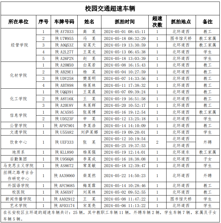 为加强校内道路交通安全管理,规范校内交通秩序,根据《MILAN.COM校园道路交通管理办法》有关要求,现将2024年5月校园交通违章车辆予以曝光,所在单位负责对本单位违章师生员工进行交通安全教育和日常管理,对于校内曝光超速的学生车辆将取消下一年度的通行证办理资格。