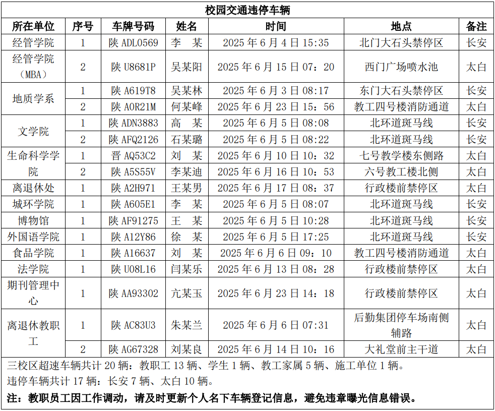 为进一步加强校园交通管理,保障校园交通安全有序,维护学校正常的教学、科研和生活秩序,切实保护师生员工的人身财产安全,根据《MILAN.COM校园交通安全管理规定》的相关要求,现将2025年6月校园交通违章车辆予以曝光,具体要求与违章信息如下: