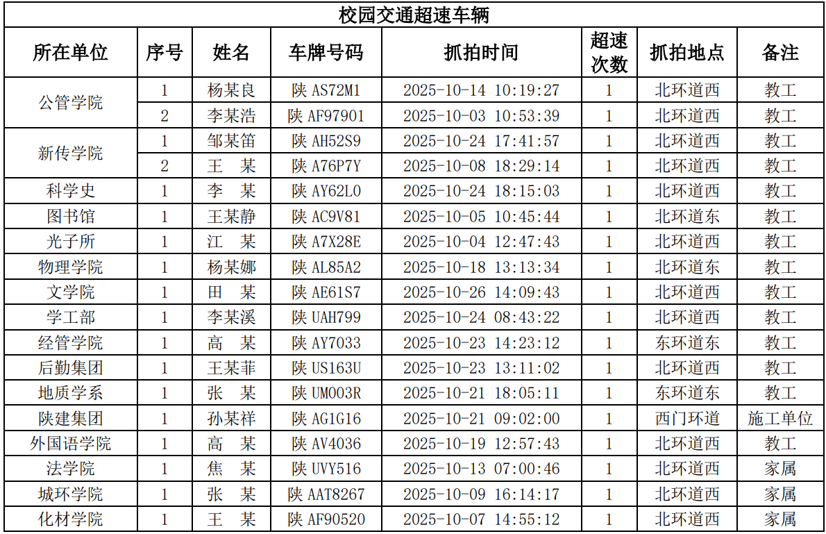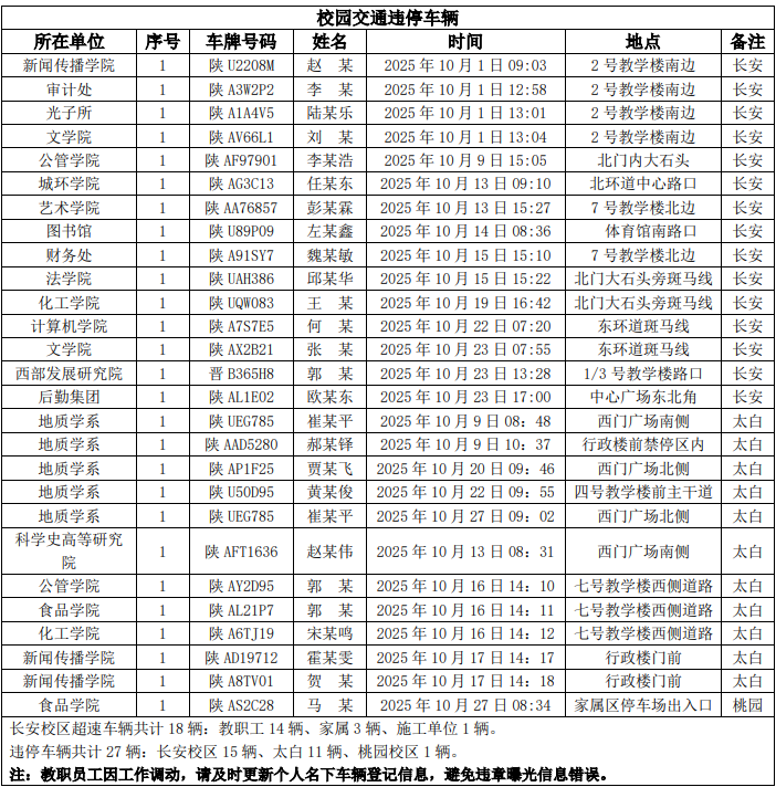 为进一步加强校园交通管理,保障校园交通安全有序,维护学校正常的教学、科研和生活秩序,切实保护师生员工的人身财产安全,根据《MILAN.COM校园交通安全管理规定》的相关要求,现将2025年10月校园交通违章车辆予以曝光,具体要求与违章信息如下: