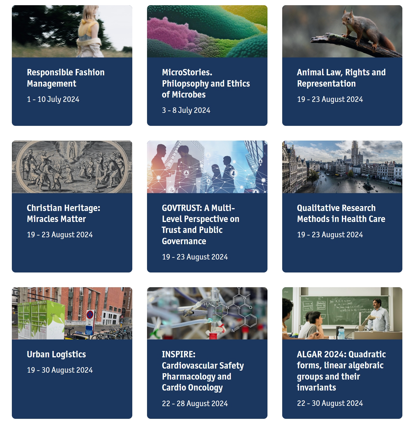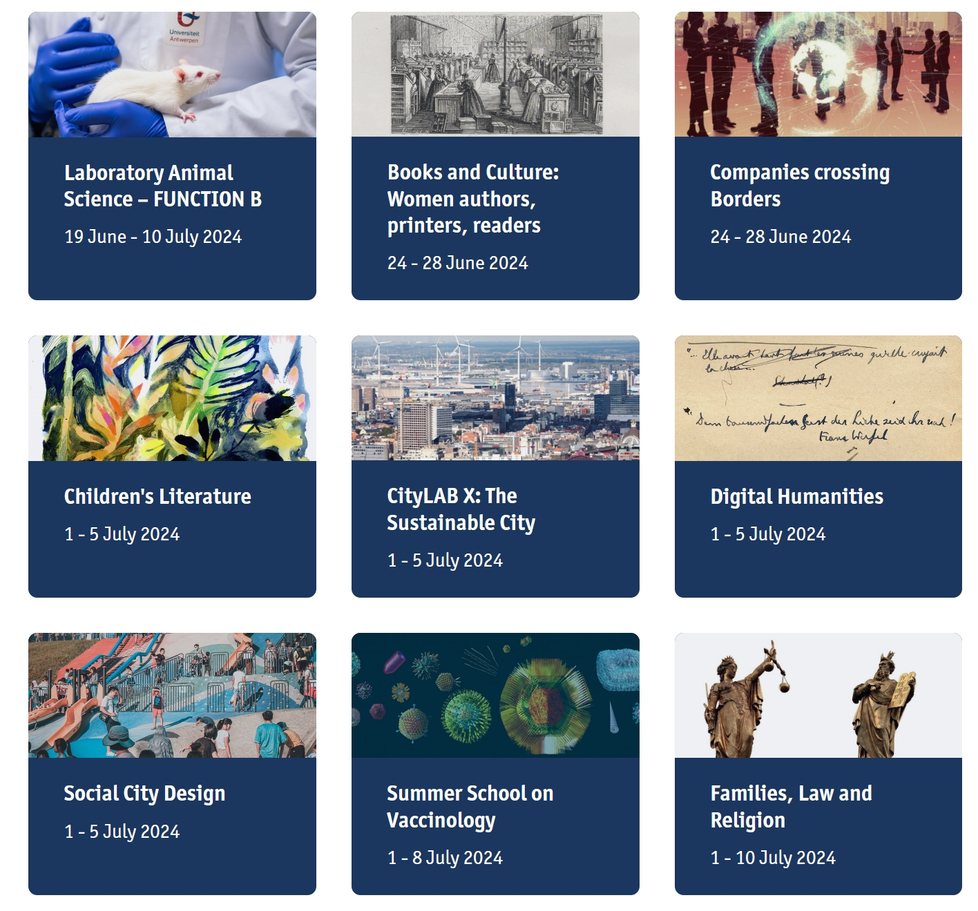 2. 各子项目信息、报名流程、申请截止时间、费用、注意事项等,可点击项目官网课程模块https://www.uantwerpen.be/en/study/programmes/antwerp-summer-winter-university/summer-winter-schools/all-summer-and-winter-schools/查看。
