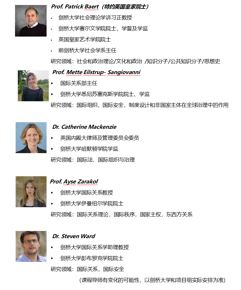 本项目以剑桥大学人文与社会科学部下各系所,特别是政治和国际关系研究系科研团队的研究内容为依托,与剑桥大学Murray Edwards学院合作,结合中国学生的专业情况,引导学生从不同维度理解自己的专业所学,了解未来发展的方向。项目课程导师阐述目前本话题领域内的研究成果和案例分析,激发同学在未来的学习研究、实践和工作中产生新的思维方法、开拓国际视野。项目还将提供沉浸式的文化活动和伦敦国际关系事务相关的机构考察。