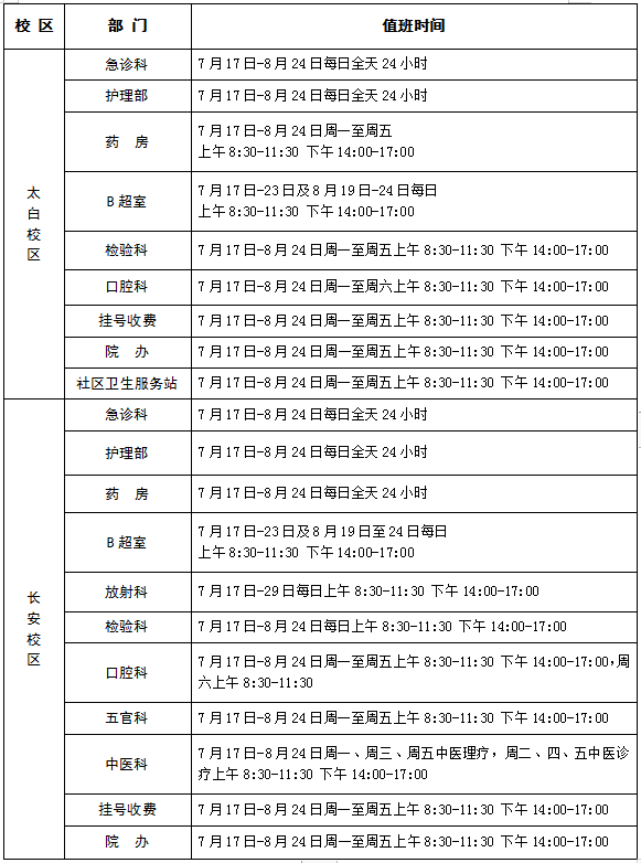 2023年校医院暑假期间医疗工作安排 作者: 编辑: 时间:2023-07-17 全体师生员工及社区居民: 根据学校《关于2023年暑假安排的通知》,为持续做好校内医疗保障,结合医院实际情况,现将暑假期间(7月17日至8月24日)校医院医疗工作安排通知如下: 一、医院值班安排 二、医院值班电话 太白校区: 029-88303120(急诊科) 029-88302922(办公室) 长安校区: 029-88309120(急诊科) 029-88308200(办公室) MILAN.COM医院 2023年7月17日