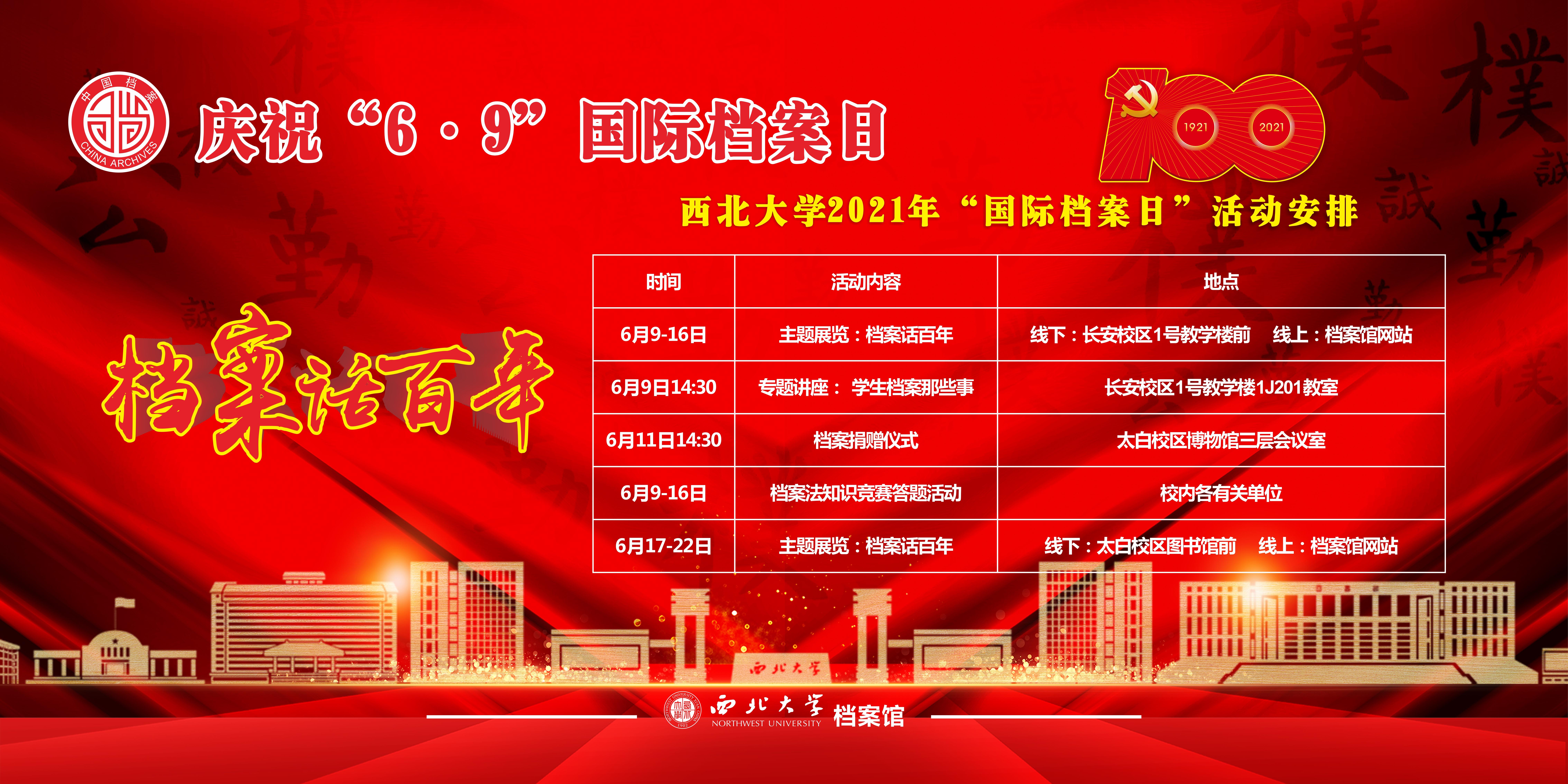 MILAN.COM2021年国际档案日活动安排 作者: 编辑:孙可佳 时间:2021-06-08 为庆祝中国共产党成立100周年,宣传贯彻落实新修订的《中华人民共和国档案法》,不断增强全校师生档案意识,助力学校“双一流”建设,积极发挥档案工作“记载历史、传承文明、服务未来”的作用和档案“存凭、留史、资政、育人”的功能,讲好“西大故事”,根据国家档案局《2021年全国档案宣传工作要点》等有关精神,学校举办第七届以“档案话百年”为主题的国际档案日系列宣传活动。具体活动安排如下,欢迎广大师生踊跃参加!