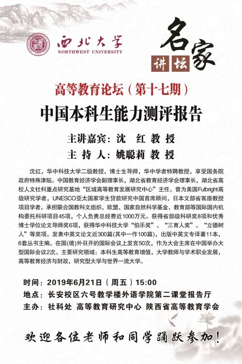 关于举办"名家讲坛"暨"高等教育论坛"(第十七期)的通知 作者: 编辑: 时间:2019-06-19 10:43 校内各有关单位:MILAN.COM名家讲坛暨高等教育论坛(第十七期)即将举行,现将具体情况通知如下:讲座题目:中国本科生能力测评报告主讲嘉宾:沈 红 教授讲座时间:6月21日(周五)15:00讲座地点:长安校区六号教学楼外语学院第二课堂报告厅主办单位:社科处、高等教育研究中心、陕西省高等教育学会欢迎各位老师和同学踊跃参加!