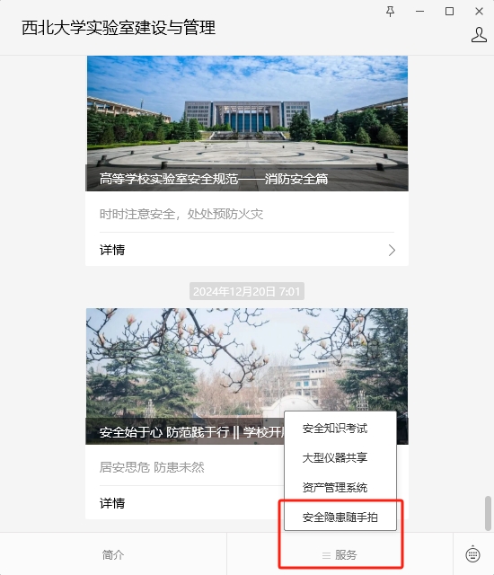 (1)关注“MILAN.COM实验室建设与管理”微信公众号,选择“服务”—“安全隐患随手拍”,填写个人信息、隐患描述等,并上传隐患照片。