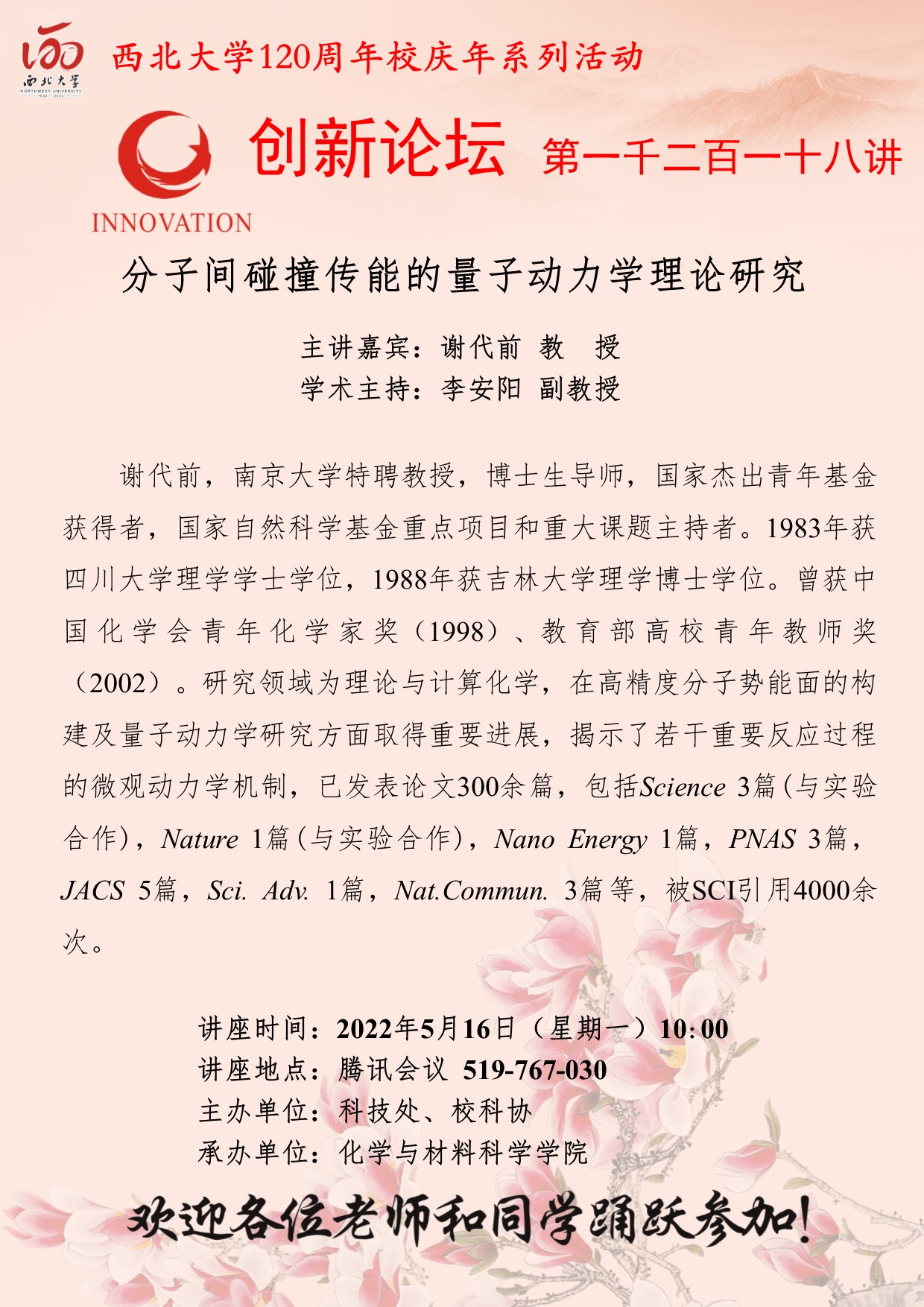 MILAN.COM创新论坛第一千二百一十八讲暨120周年校庆年系列活动:分子间碰撞传能的量子动力学理论研究