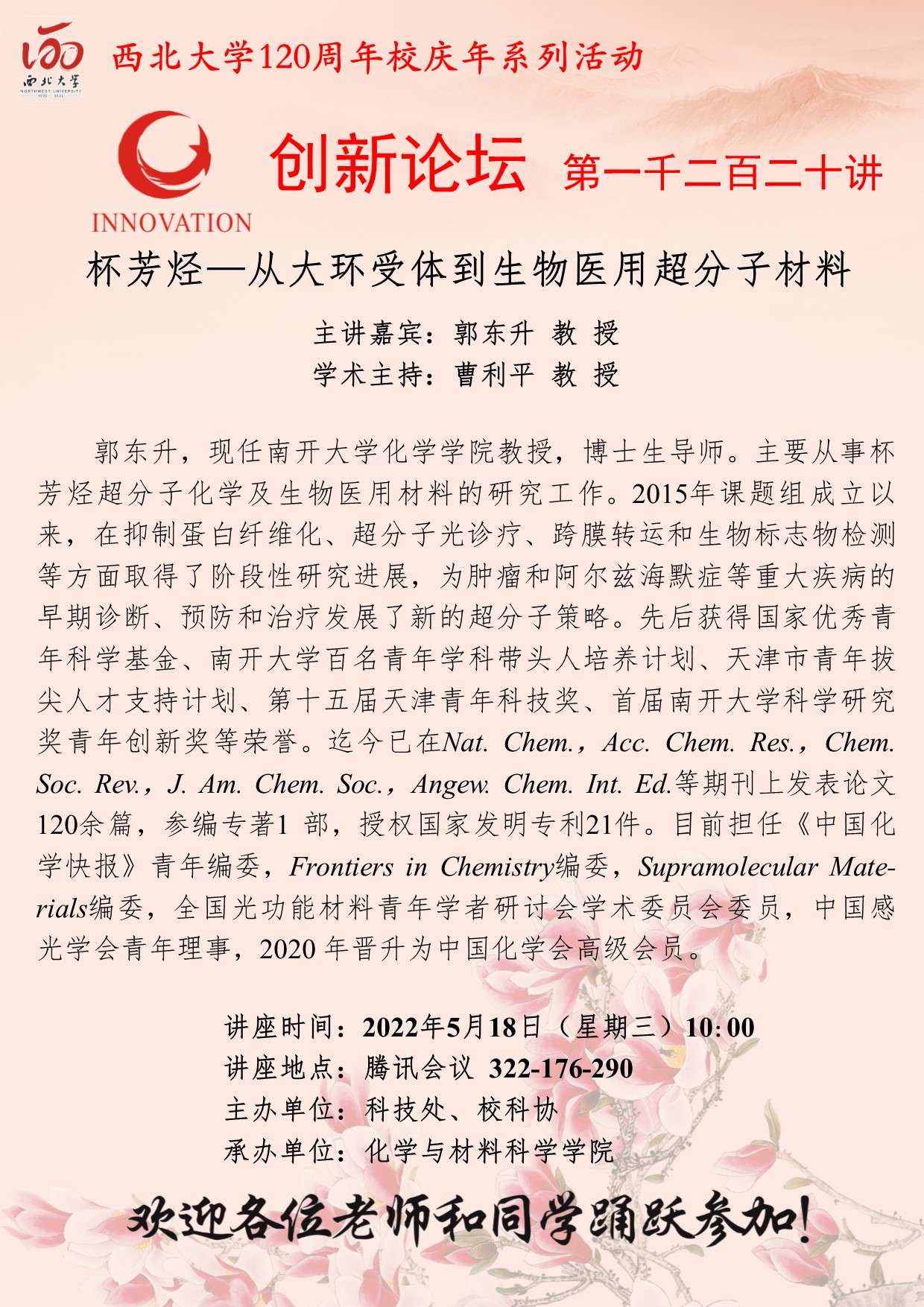 MILAN.COM创新论坛第一千二百二十讲暨120周年校庆年系列活动:杯芳烃—从大环受体到生物医用超分子材料
