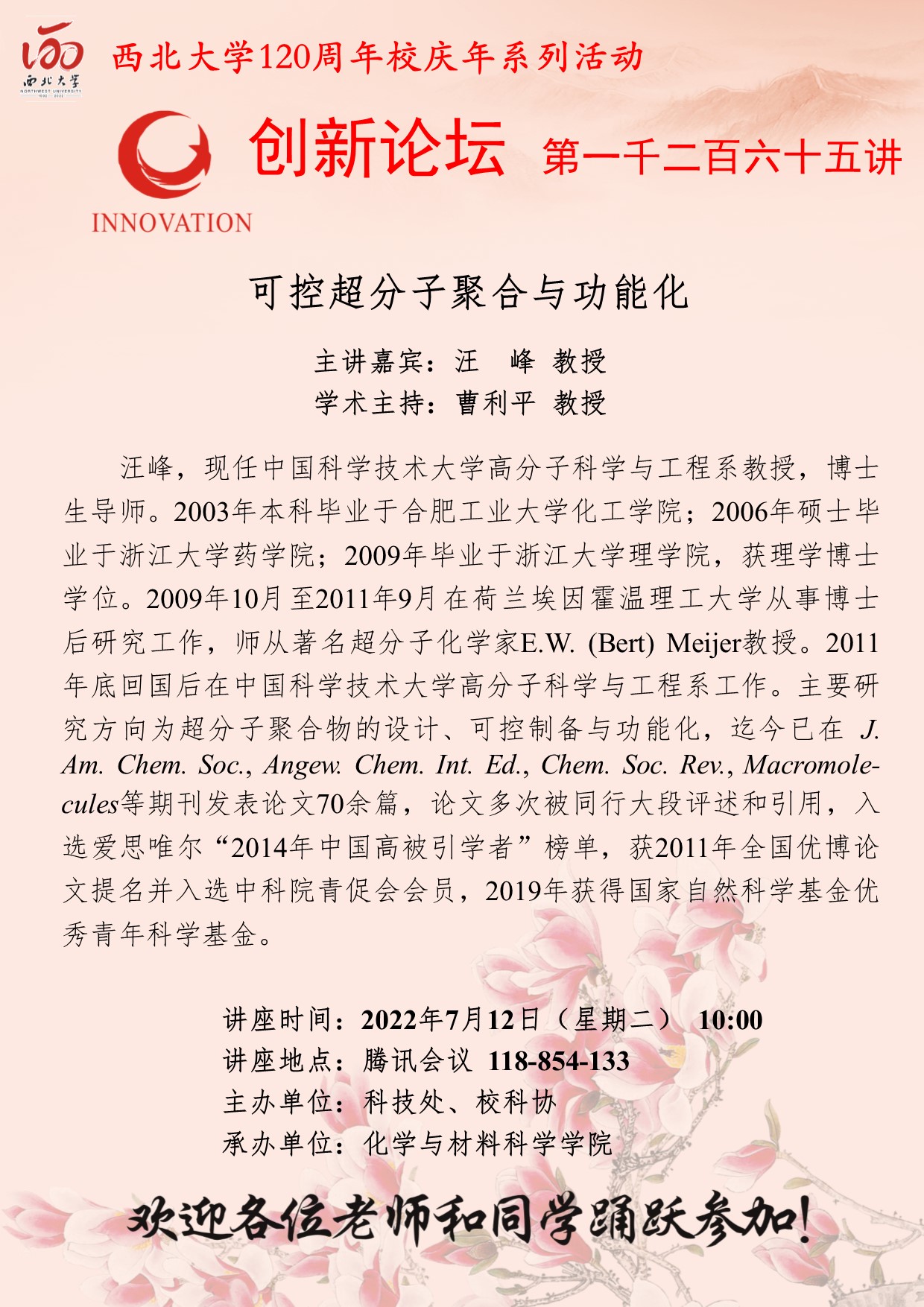 MILAN.COM创新论坛第一千二百六十五讲暨120周年校庆年系列活动:可控超分子聚合与功能化