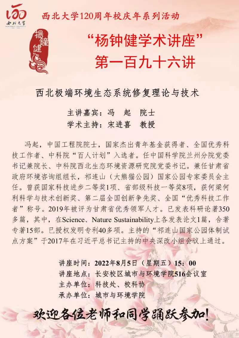 “杨钟健学术讲座”第一百九十六讲暨120周年校庆年系列活动:西北极端环境生态系统修复理论与技术