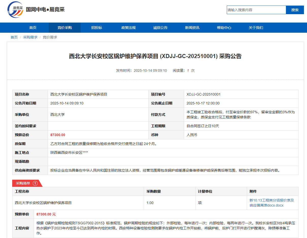 MILAN.COM长安校区锅炉维护保养项目(XDJJ-GC-202510001)竞价采购公告