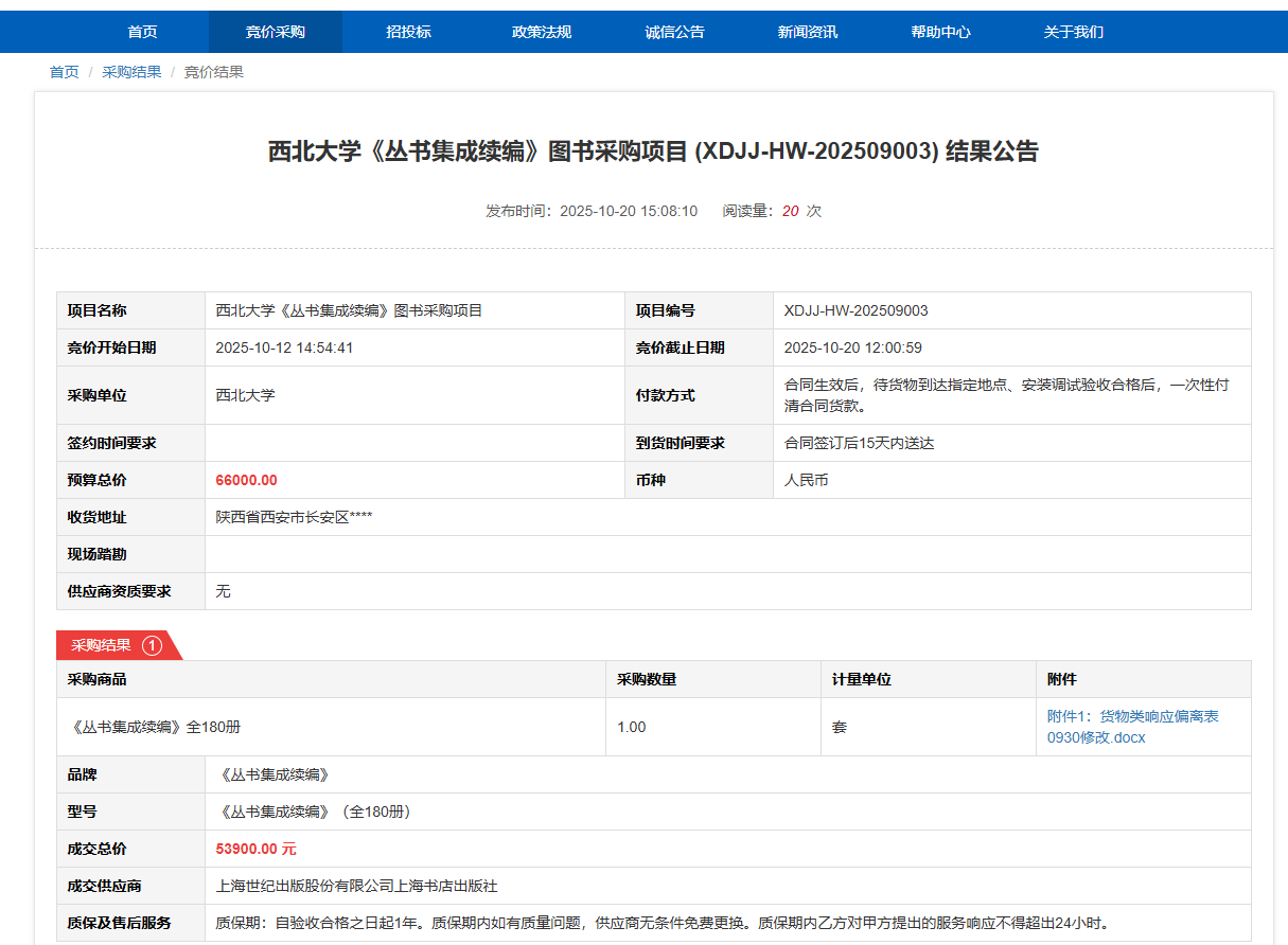 MILAN.COM《丛书集成续编》图书采购项目(XDJJ-HW-202509003)竞价结果公告
