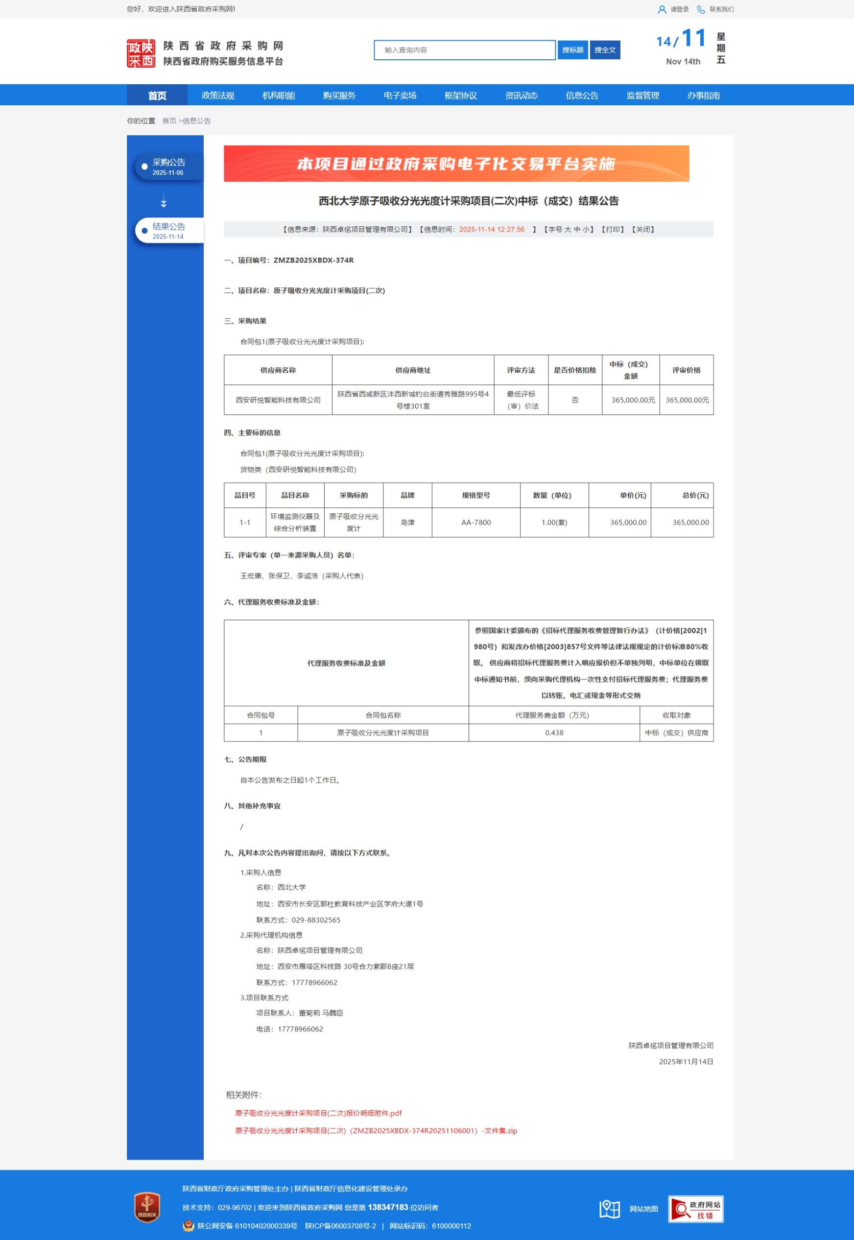 MILAN.COM原子吸收分光光度计采购项目(二次)中标(成交)结果公告 作者:国有资产管理处 编辑:国有资产管理处 时间:2025-11-14 原公告链接:https://www.ccgp-shaanxi.gov.cn/freecms/site/shaanxi/ggxx/info/2025/8a69c0019a7093fe019a809bb04552f8.html?noticeType=001023¬iceId=83d81046-c114-11f0-8063-08c0eb20c666