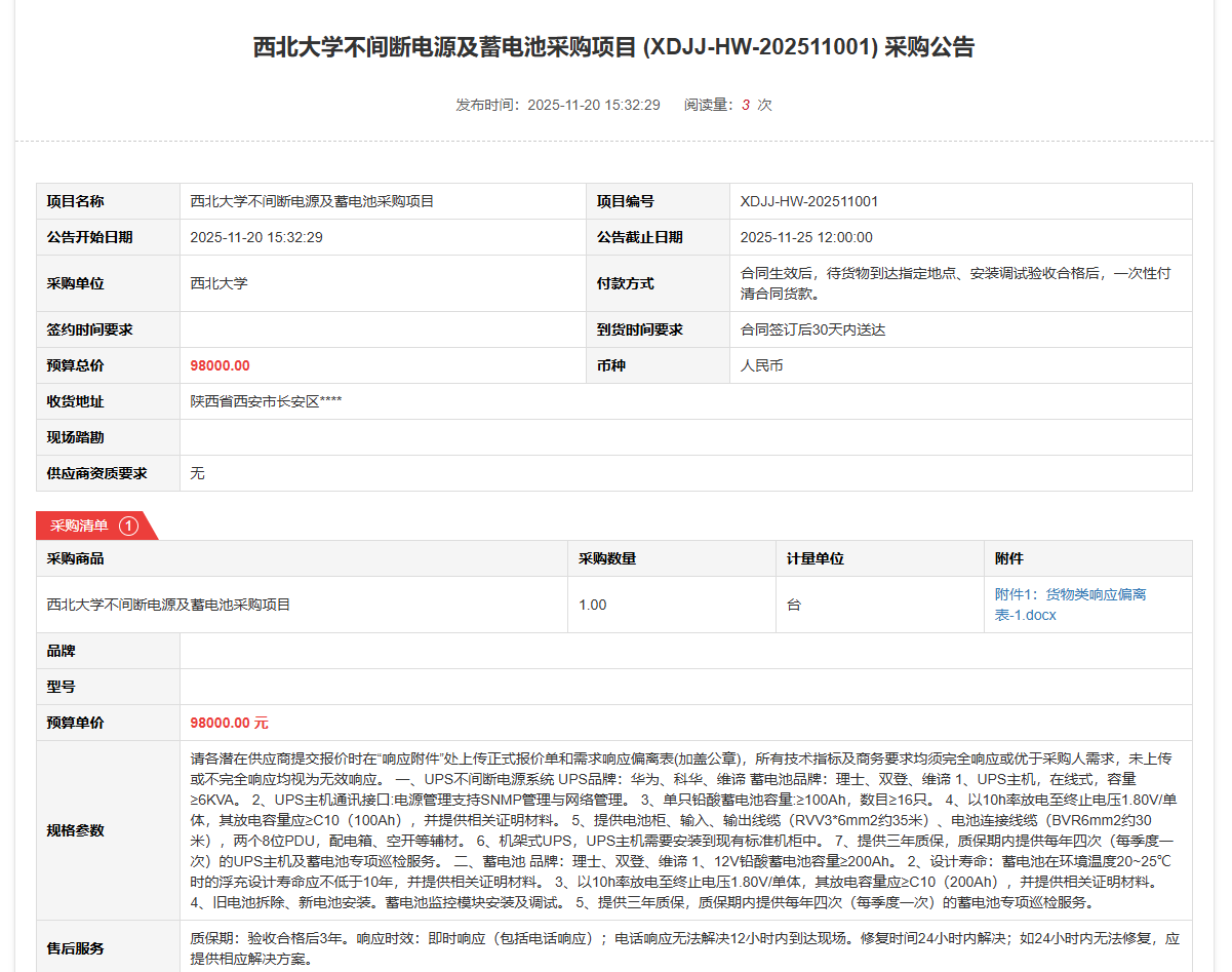 MILAN.COM不间断电源及蓄电池采购项目(XDJJ-HW-202511001)竞价采购公告