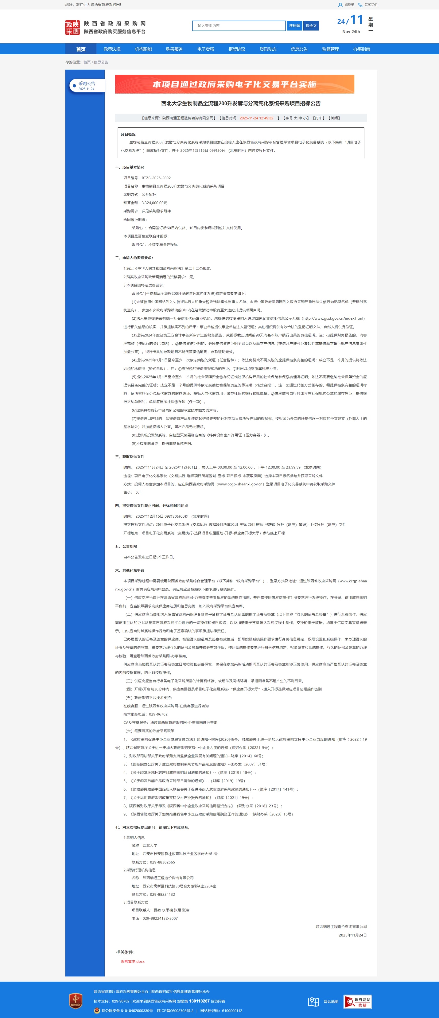 MILAN.COM生物制品全流程200升发酵与分离纯化系统采购项目招标公告 作者: 编辑:国有资产管理处 时间:2025-11-24 原公告链接:https://www.ccgp-shaanxi.gov.cn/freecms/site/shaanxi/ggxx/info/2025/8a69c6d09a636c6c019ab41e3479334d.html?noticeType=001011¬iceId=34afdb62-c8f3-11f0-8063-08c0eb20c666