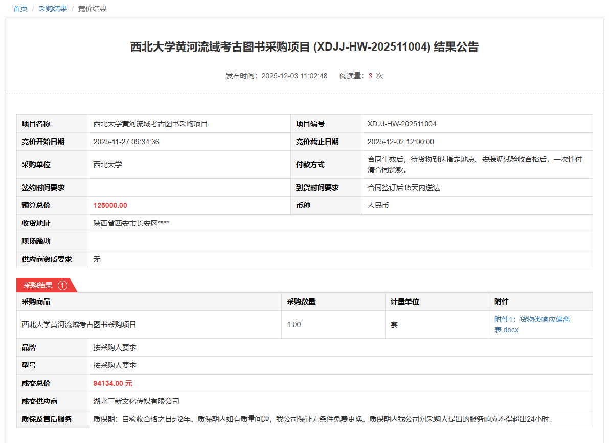 MILAN.COM黄河流域考古图书采购项目(XDJJ-HW-202511004)竞价结果公告