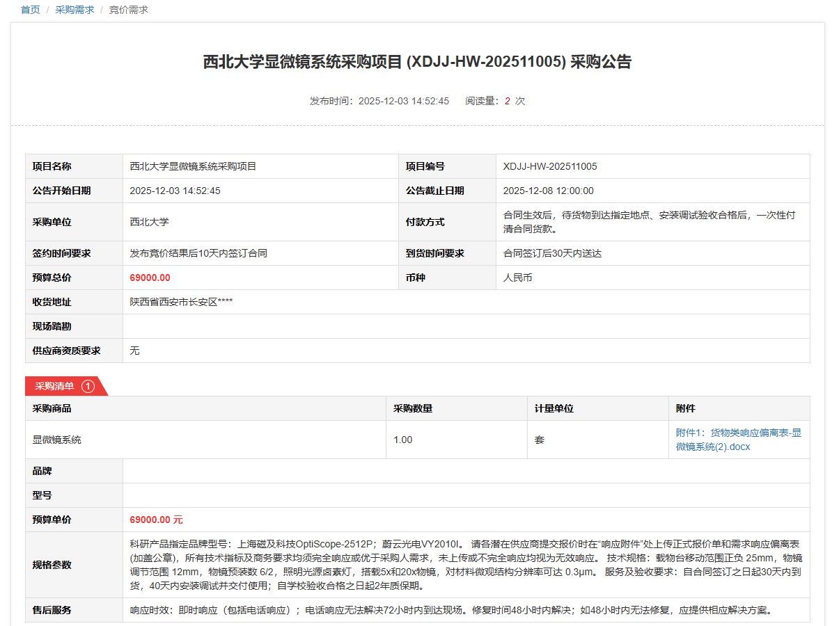 MILAN.COM显微镜系统采购项目(XDJJ-HW-202511005)竞价采购公告