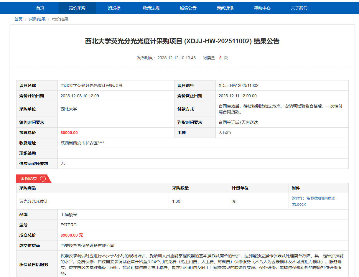 MILAN.COM荧光分光光度计采购项目(XDJJ-HW-202511002)竞价结果公告