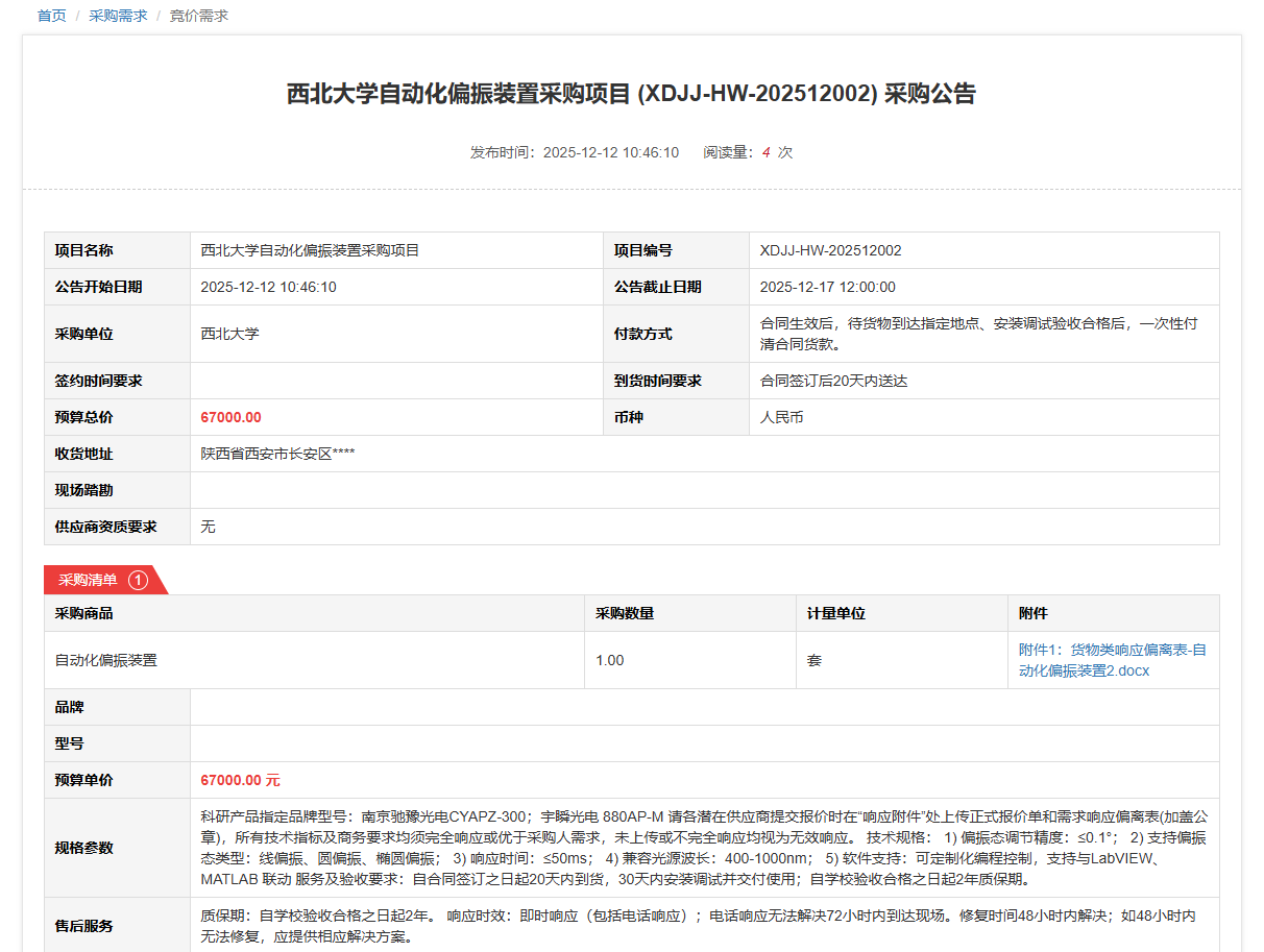 MILAN.COM自动化偏振装置采购项目(XDJJ-HW-202512002)竞价采购公告